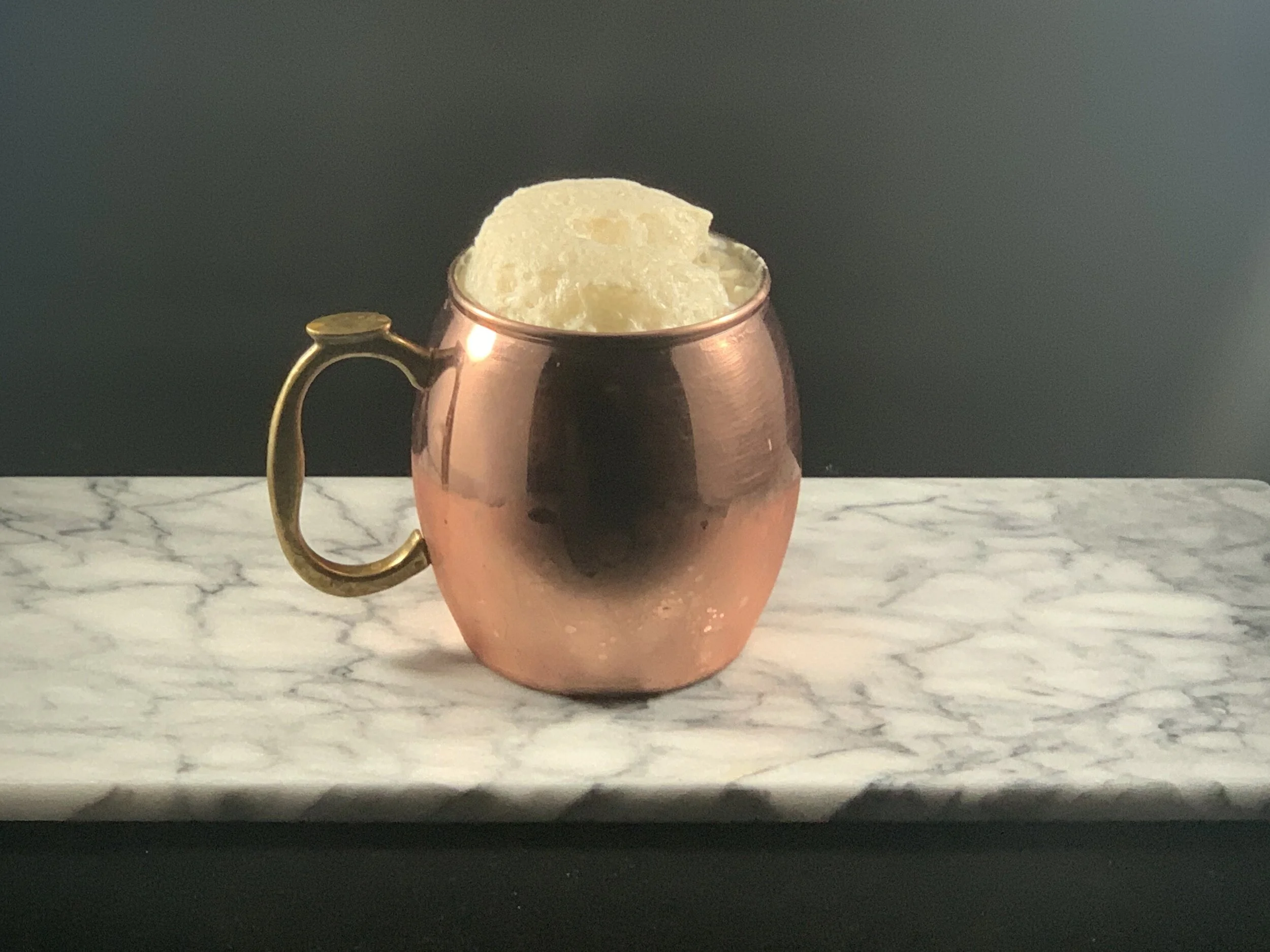 - Put about 3-4 ice cubes into a copper mug (or any mug) and add the ice cream mixture to 3/4 full.