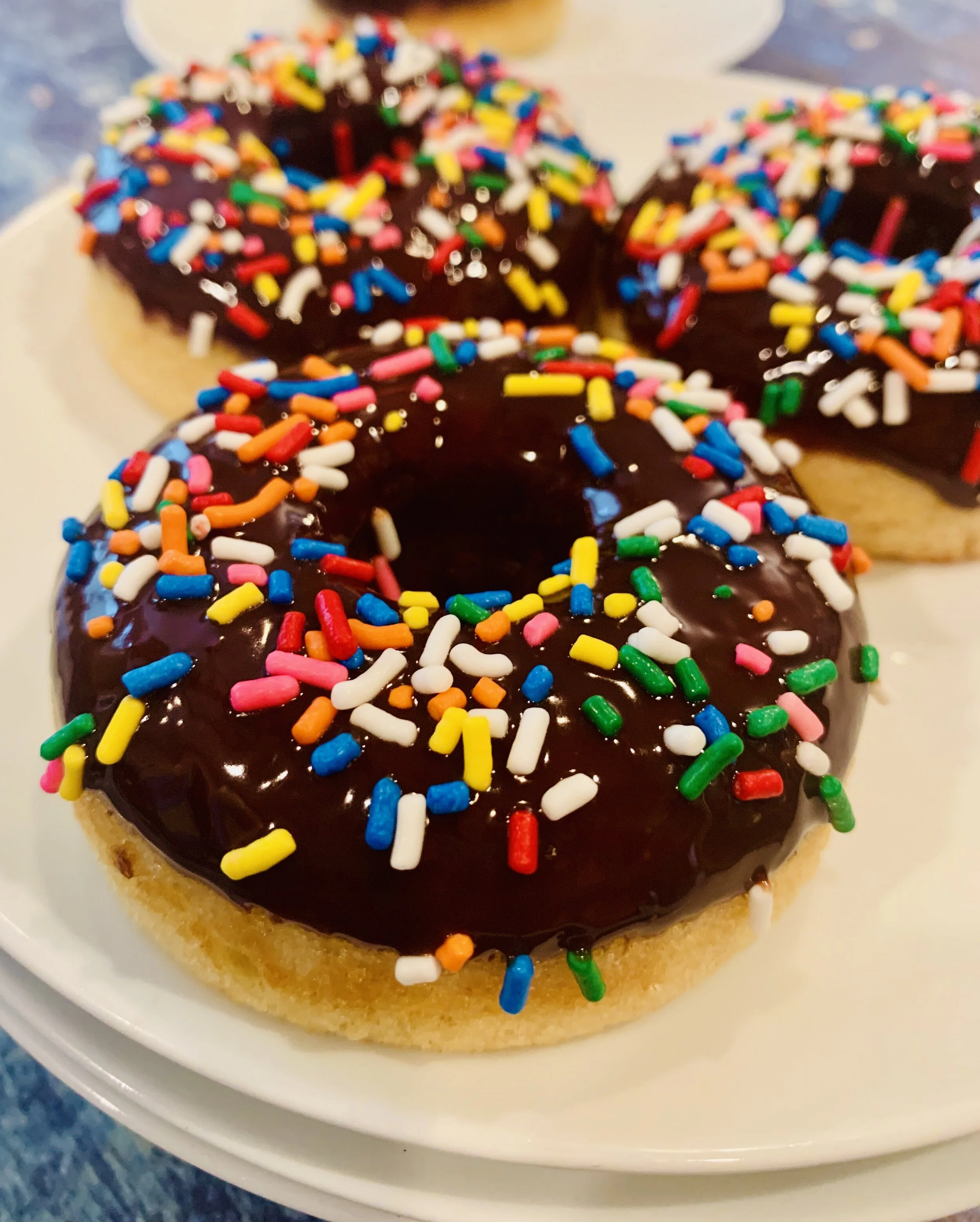 - To decorate the donuts, dip them halfway into the glaze and slightly turn the donut as you are taking it out of the glaze and place it on a cooling rack. Sprinkle top with confetti sprinkles or your choice of sprinkles