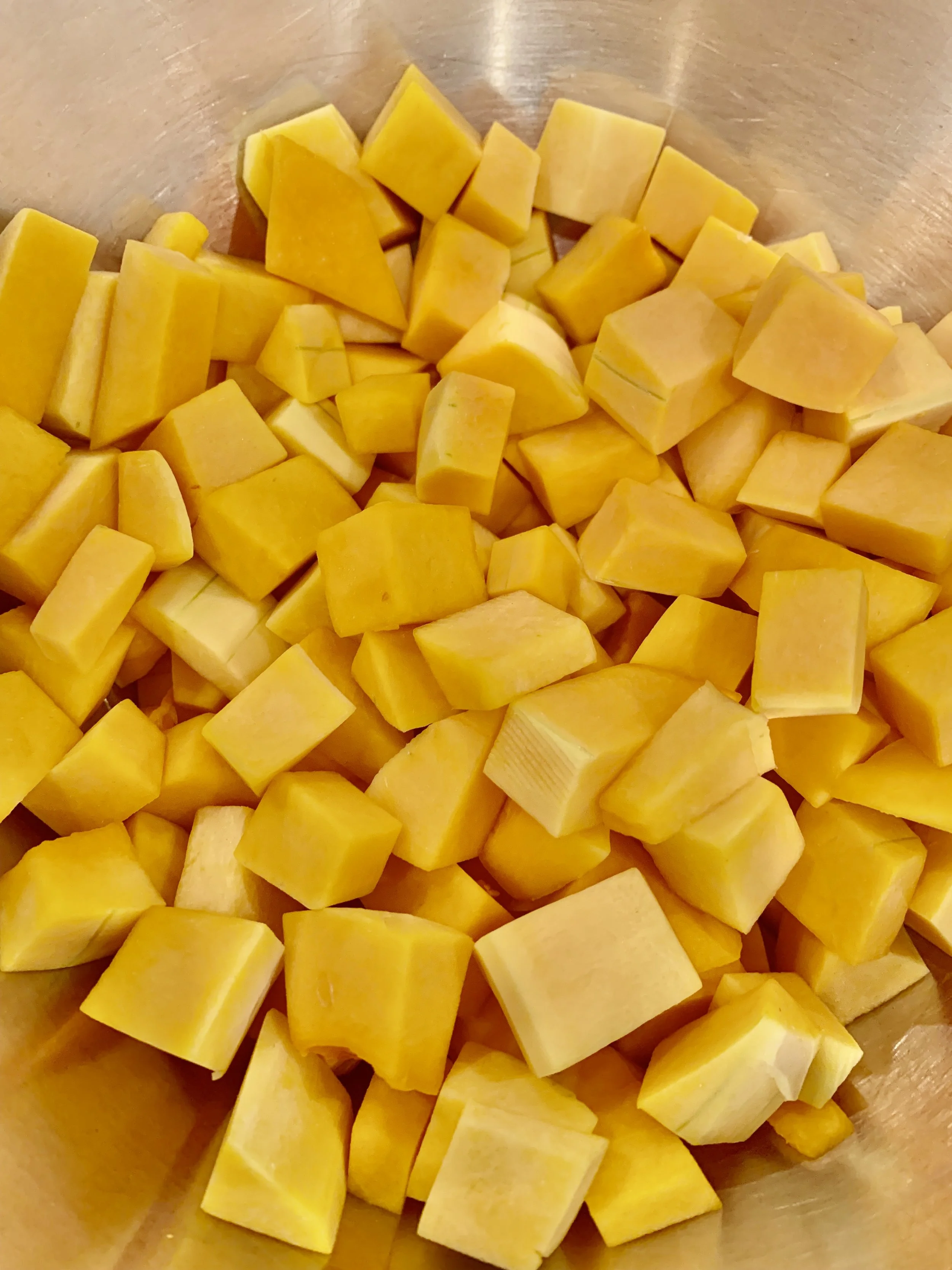 - Peel the outer layer of butternut squash and slice it in half, take out the seeds and cut into cubes.