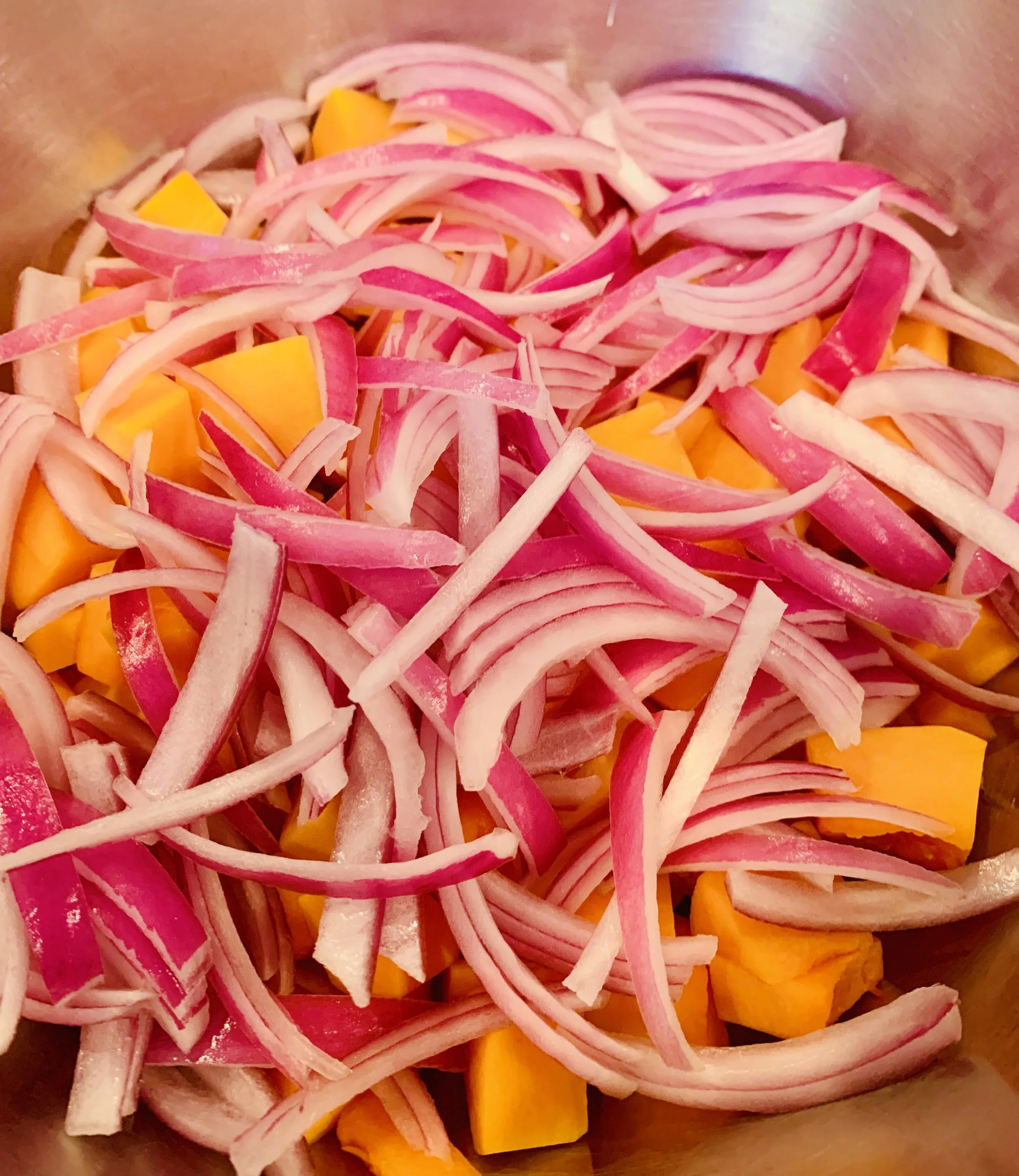 - Place squash into a large bowl and add sliced red onions and olive oil and stir with a wooden spoon until oil coats everything.