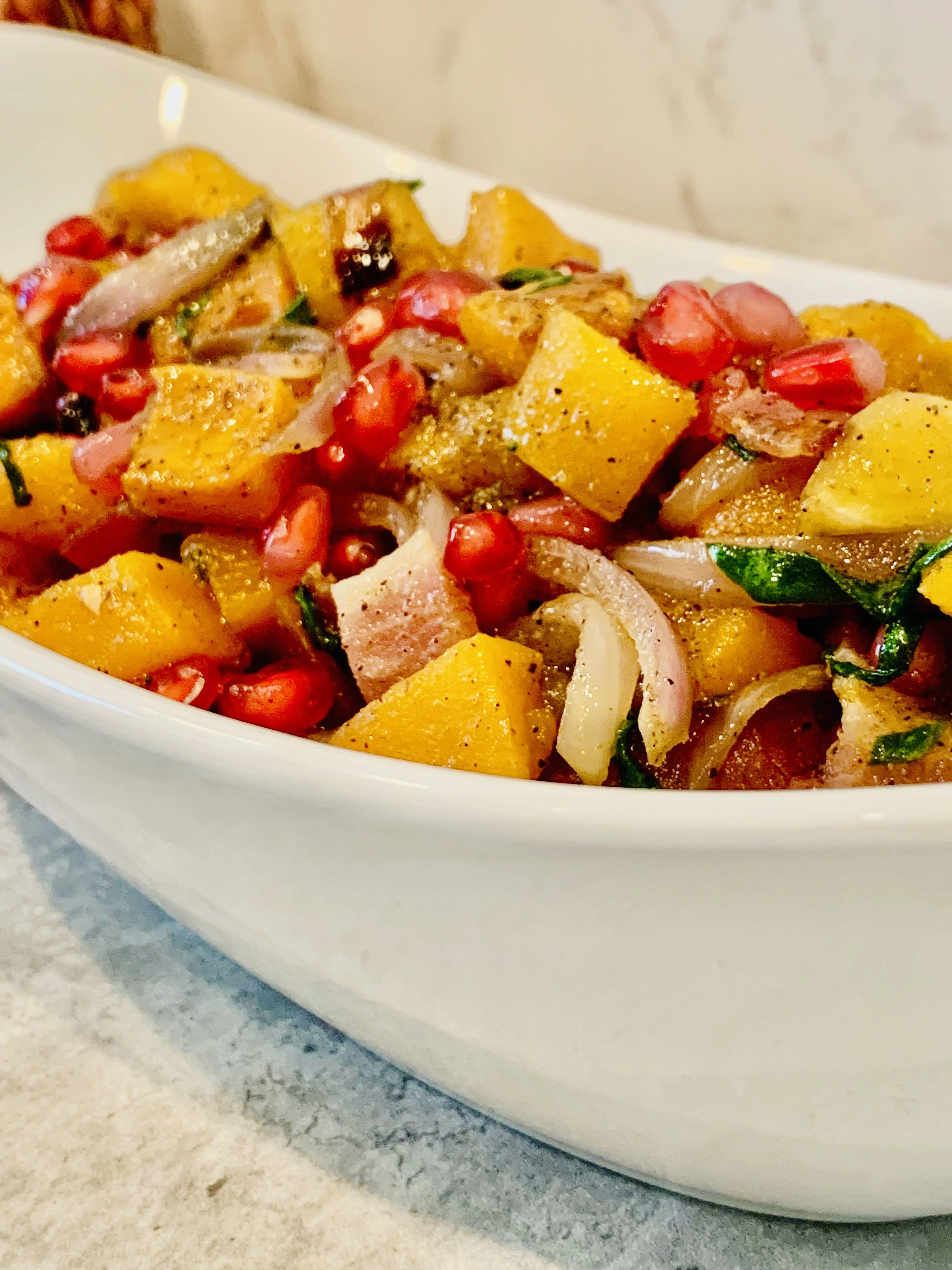 - Once you pull the squash out of the oven set it to the side. Now add the spinach and pomegranate seeds to the dish and stir to combine.