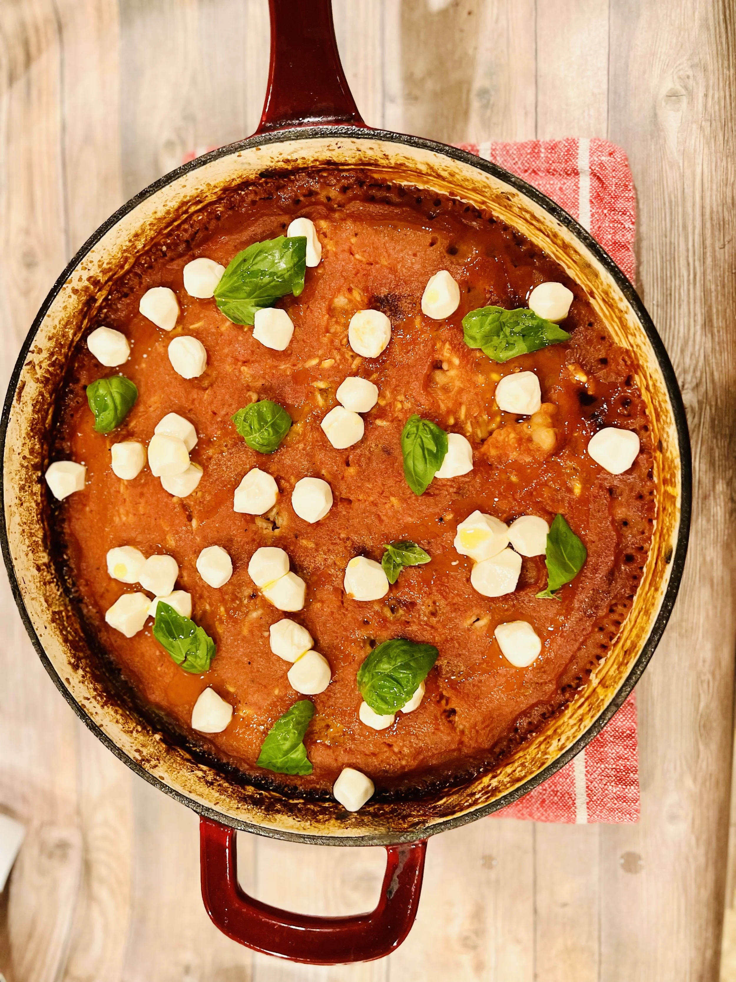 This base sauce is delicious with any pasta dish. It’s just bursting with flavor. If you do pair it with pasta, skip the oven and just cook the sauce for about 5-10 and add to cooked pasta.